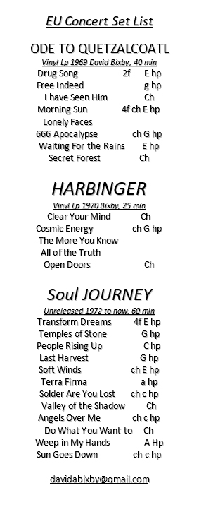 Shows Past Performances Festival of Endless Gratitude, Copenhagen, 2018 Festival of Endless Gratitude, Copenhagen, 2018 Festival of Endless Gratitude, Copenhagen, 2018 Festival of Endless Gratitude, Copenhagen, 2018 Festival of Endless Gratitude, Copenhagen, 2018 Festival of Endless Gratitude, Copenhagen, 2018 Festival of Endless Gratitude, Copenhagen, 2018 Festival of Endless Gratitude, Copenhagen, 2018 Festival of Endless Gratitude, Copenhagen, 2018 Festival of Endless Gratitude, Copenhagen, 2018 Festival of Endless Gratitude, Copenhagen, 2018 Bart’s, Ojai, 2016 Cafe on A, Oxnard, 2016 Trinosophies, Detroit, 2014 Detroit, 2013 Peoria, IL, 2011 Upcoming Shows TBD… Contact David for booking inquiries. Dave Bixby – Live in London 2023 David Bixby EU Concert Set List 2023 Inok Alrutz, David Bixby, and Dean Merrell after his performance in Jerome, Arizona on March, 4th 2023